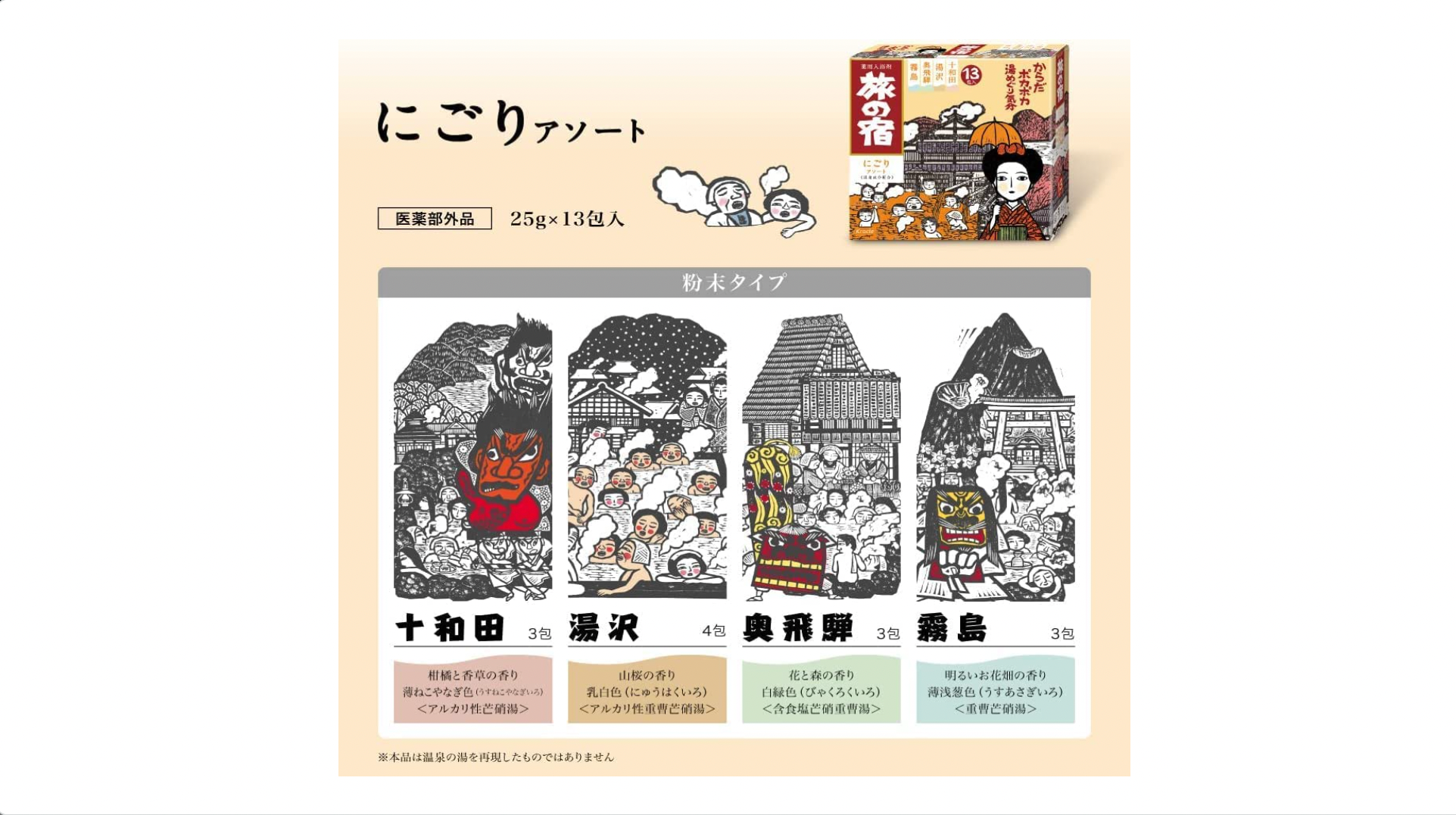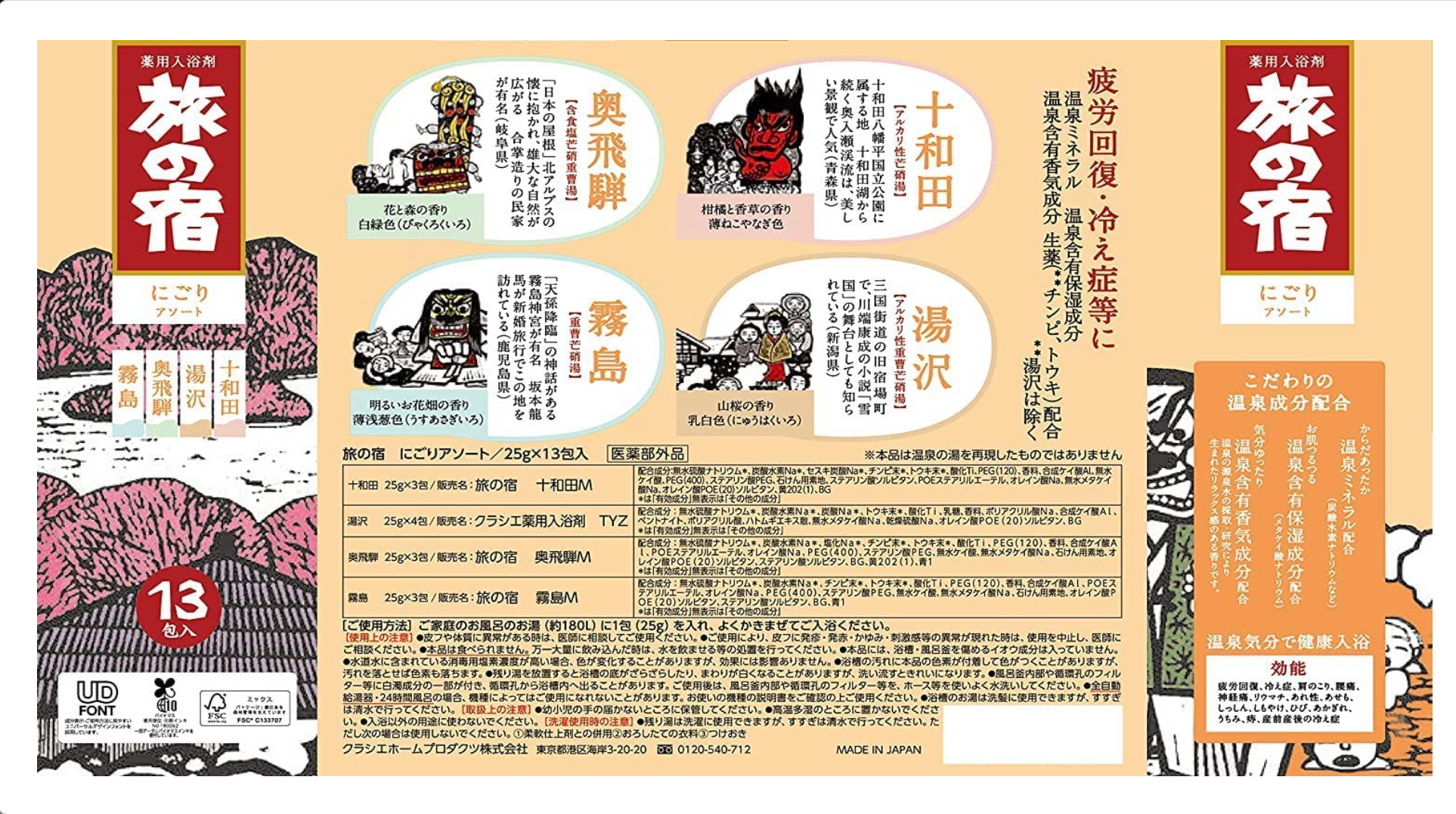 Towed is located in Aomori Prefecture (青森縣). It is rich in minerals such as sulfur and is believed to have detoxifying properties. This bath powder is said to be particularly effective in relieving muscle fatigue and promoting relaxation.